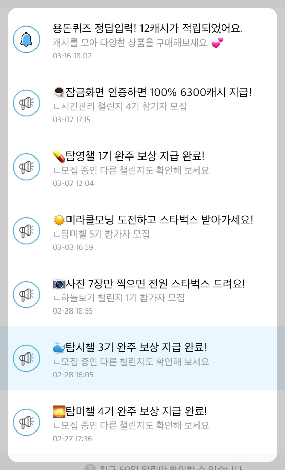 타임스프레드 첫 화면 ▶ 오른쪽 상단 "종모양" 알림 ▶ 아래처럼 다양한 챌린지 내용들이 공지되어 있어요. 예를 들어 미라클모닝 도전하고 스타벅스 받아 가세요 처럼 챌린지 내용들이 계속해서 업데이트되고, 7일만 사진인증하면 되는 거라 쉽게 쉽게 득템이 가능합니다.